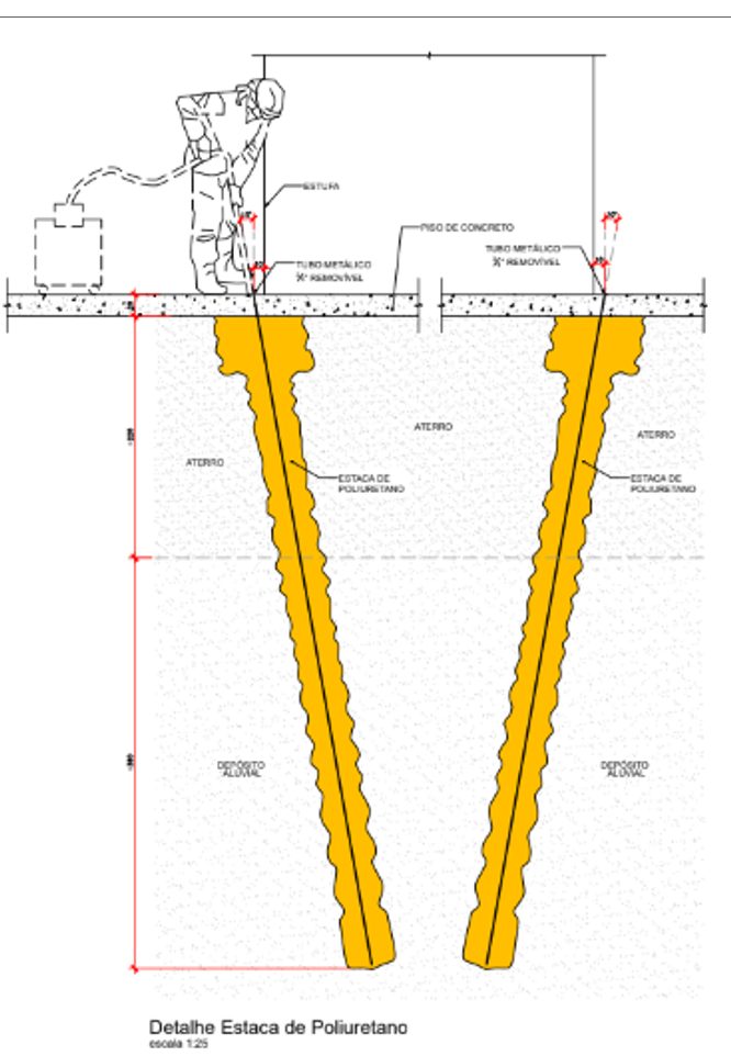 Propusemos o microestaqueamento com resina geotécnica. Com o produto PARAMET PG 3154, uma resina bicomponente, injetamos 44 microestacas para nivelar e estabilizar o piso e bases de equipamentos. Esta tecnologia de injeções químicas em solo (Deep Injection) aumenta a capacidade de carga do solo sem grandes intervenções.